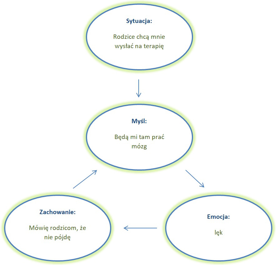 Przyjmijmy, że myślisz, że na terapii będziemy: „prać Ci mózg” – czyli robić coś po za Twoją kontrolą, sprawiając, że będziesz podporządkowany wszystkim dorosłym (tak, jest to autentyczny przykład jednego z moich pacjentów, który pozwolił go wykorzystać), takie myślenie sprawia, że się boisz i w konsekwencji nie chcesz rozmawiać z terapeutą i milczysz. Poniżej przedstawiam Ci tak zwane „błędne koło”, które porządkuje to tak, jak robimy to w gabinecie:
