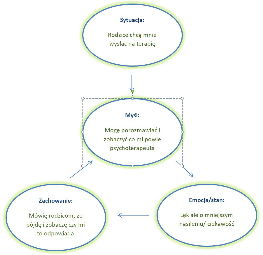Terapia CBT przeznaczona jest już dla dzieci od 7 roku życia, jej celem jest pokazanie Ci związku między myślami, uczuciami i zachowaniem. Zobaczmy to na przykładzie: