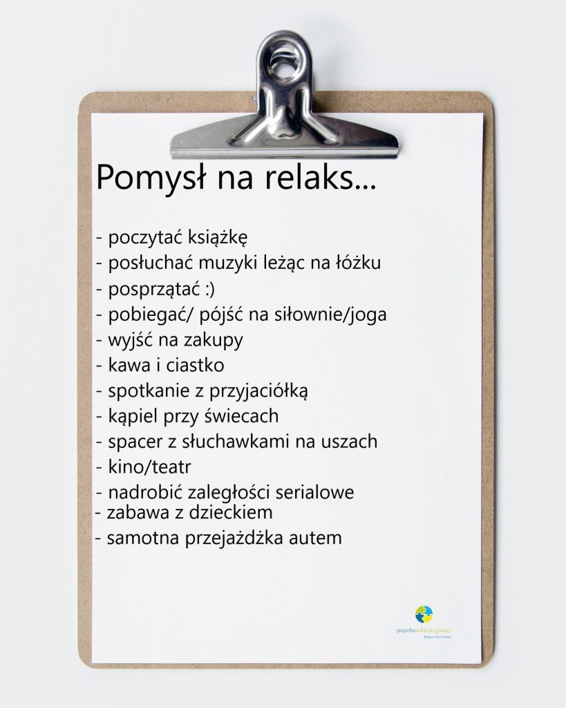 Zrób listę rzeczy, które pomagają Ci odpocząć i się zrelaksować, a później korzystaj z niej. Poniżej przedstawiam jak może wyglądać taka lista.